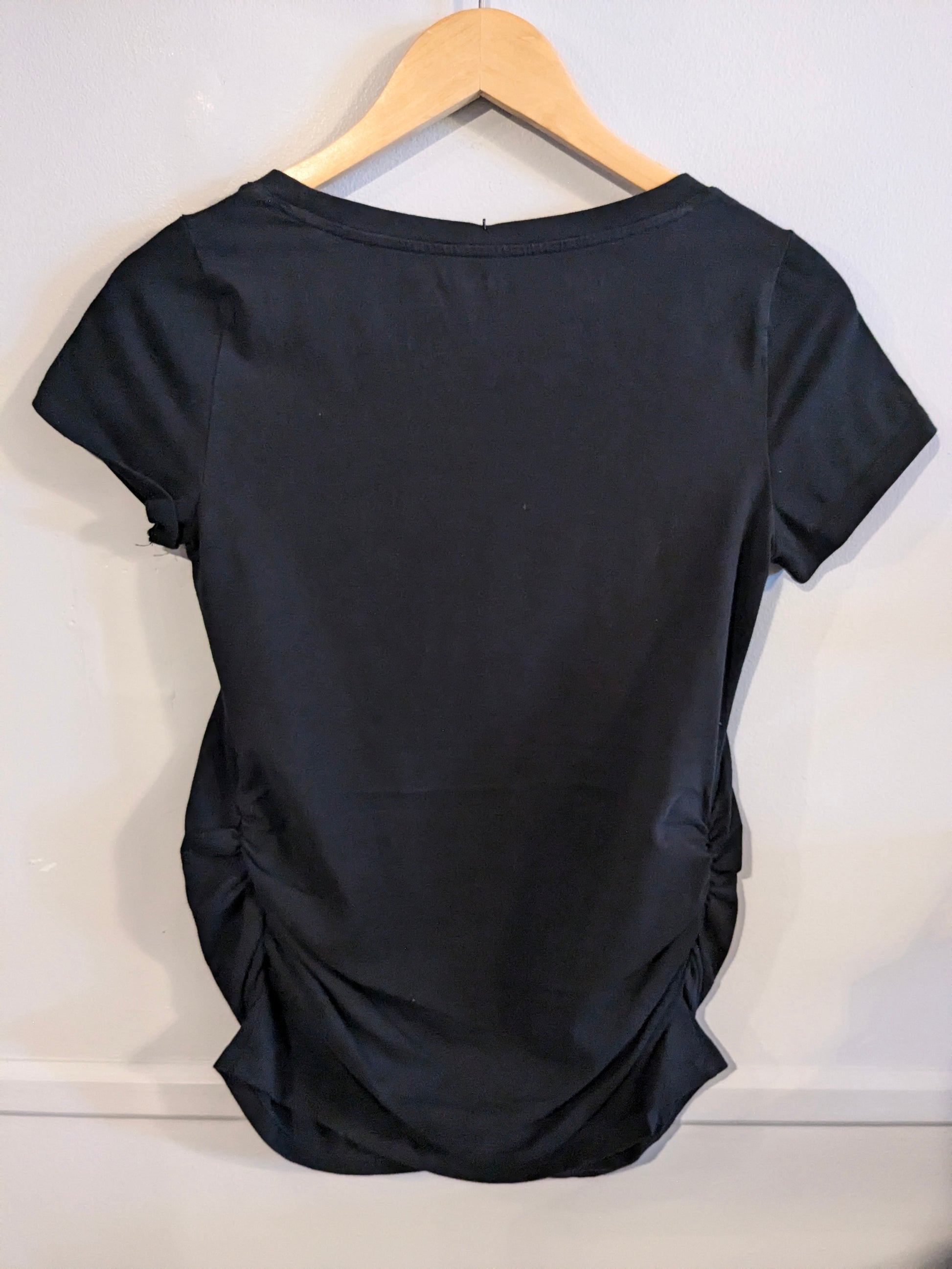 Details: A classic round neck tee with ruched sides and a slightly rounded hem. Style with your fav boyfriend jeans & sandals for a trendy look. The blended fabric offers plenty of fitted stretch throughout pregnancy to keep you comfy yet adorable.