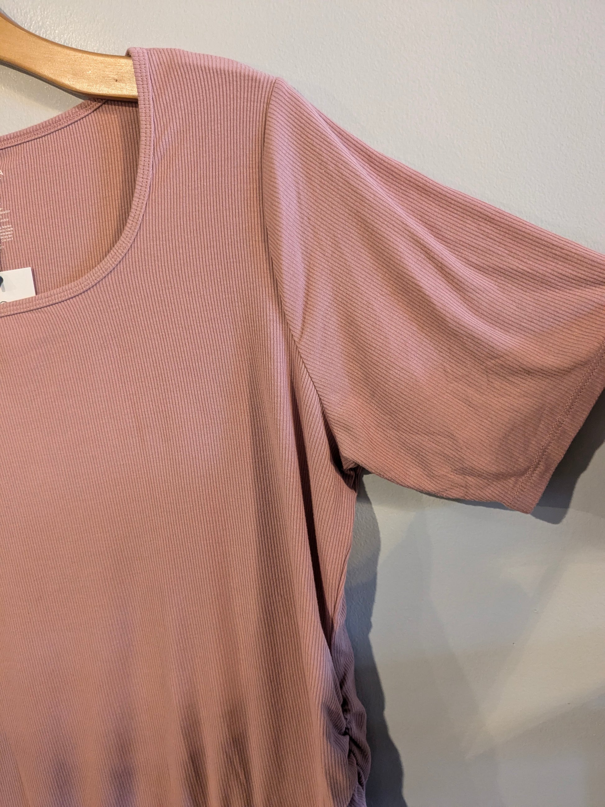 Details: Featuring a round neck, short sleeves, ruched sides, ribbed knit, and straight hem, this is an essential fitted tee in a feminine hue. Pair with your fav denim & comfiest sneaks for a modern look.